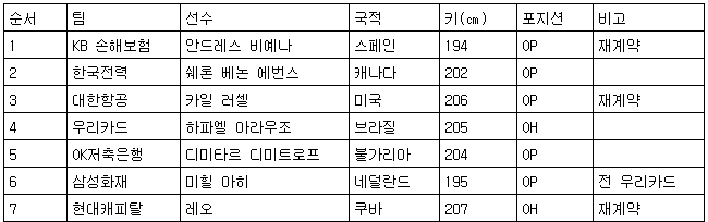 1순위 지명권은 안드레스 비예나(등록명 비예나)와 재계약을 선택한 KB손해보험에 돌아갔다.