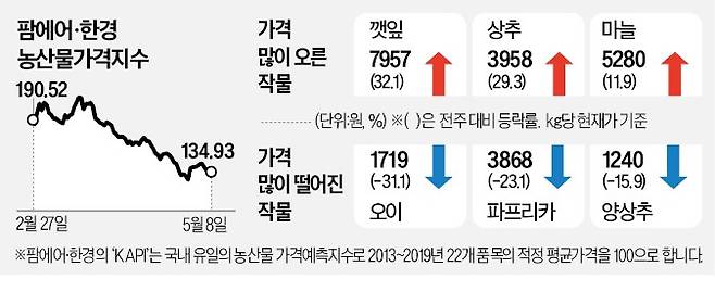 9일 팜에어·한경 농산물가격지수(KAPI)를 산출하는 가격 예측 시스템 테란에 따르면 전날 기준 깻잎 도매 가격은 ㎏당 7957원을 기록했다. 1주일 전보다 32.1%, 1년 전보다 58.2% 상승했다. 상추와 부추의 도매 가격은 각각 3958원, 2551원으로 전주 대비 29.3%, 11.7% 올랐다.