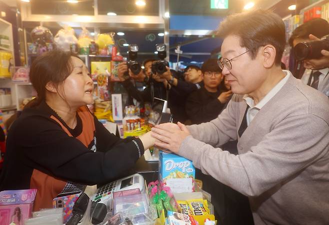 | ▲ 더불어민주당 이재명 대선 후보가 제3차 골목골목 경청투어로 경북지역 방문에 나선 9일 경북 경주시의 한 문방구를 방문해 가게 상인과 이야기하고 있다. |