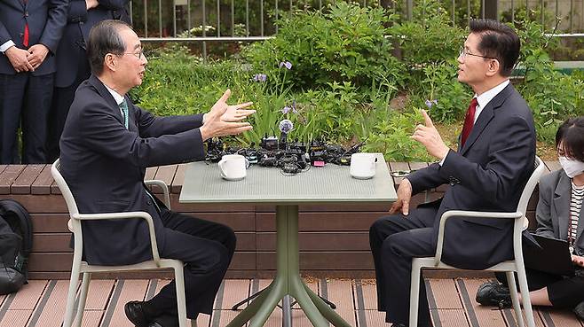 ▲ 무소속 한덕수 대선 예비후보가 8일 서울 국회 사랑재에 위치한 커피숍에서 국민의힘 김문수 대선후보와 후보 단일화 관련 회동을 하고 있다.