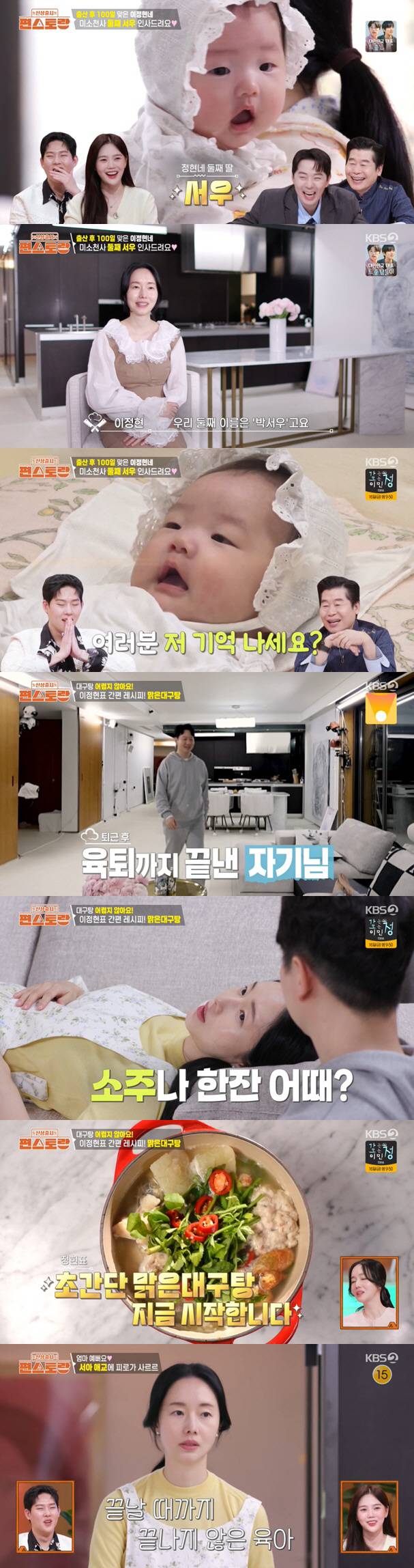 아이들을 겨우 재운 밤. 한숨 돌릴 여유가 생긴 이정현은 퇴근한 남편에게 "아직 저녁도 못 먹었다. 밥 대신 시원한 국물에 소주 한 잔 어때?"라고 물었다. 잠시 후 부부는 마주 앉아 이정현이 간단한 레시피로 끓인 맑은대구탕을 맛봤다. "아흐~ 피로가 싹 풀린다"라는 감탄이 절로 나오는 맛이었다.