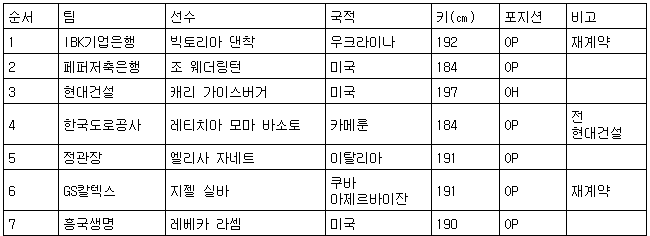2025-2026시즌 여자부 외국인 선수는 재계약 2명, 이적 1명, 경력직 1명, 새 얼굴 3명으로 구성됐다.
