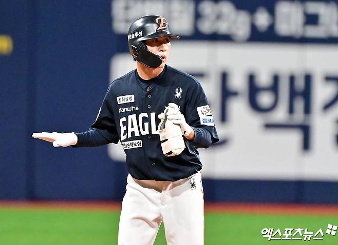9회초 2사 3루 한화 이상혁이 1타점 2루타를 날린 후 타임을 요청하고 있다.