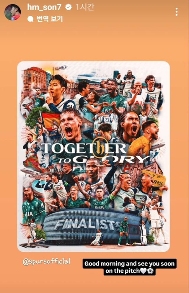 손흥민은 9일(이하 한국시간) 자신의 인스타그램 스토리에 토트넘의 UEL 결승행을 기념한 'Together to GLORY(우리 함께 영광으로)' 포스터를 공유했다.