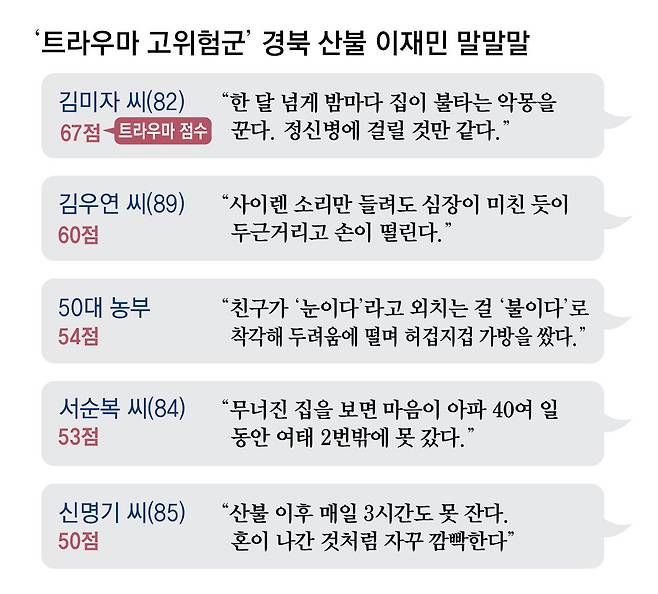 조사 결과 취재팀이 만난 이재민 20명 중 12명은 고위험군으로 나타났다. 당장 트라우마 상담 등 심리치료가 필요한 상태였다. 7일 영덕군 영덕읍 화천리에서 만난 서순복 씨(84)는 “검은색만 봐도 다 타버린 집이 떠올라 눈물부터 난다”며 “한평생 살아온 집이 없어진 걸 볼 수가 없어 여태 딱 2번 갔다”고 했다. 그의 트라우마 점수는 53점으로 매우 높았다. 속곡리 주민 김정민 씨(68)는 산불 이후 낯선 차량과 사람을 경계하게 됐다. 김 씨는 “누가 또 산에 불을 지르는 건 아닐지 조마조마한 상태”라고 했다.