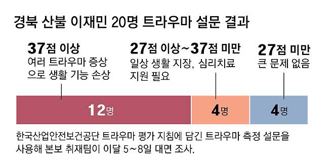 3월 22일 경북 의성에서 시작된 역대 최악의 산불 사태가 이달 11일이면 발생 50일째다. 불은 진화됐고 주요 뉴스에서도 멀어졌지만, 피해를 입은 당사자들은 여전히 극심한 정신적 고통(트라우마)에 시달리며 이전과 달라진 삶을 살고 있었다. 동아일보는 5∼8일 한국산업안전보건공단 트라우마 평가 지침에 따른 설문을 활용해 이재민 20명을 심층 인터뷰했다. 그 결과 20명 중 12명(60%)은 정상적인 생활이 어려워 정신건강의학과 등 병원 치료가 필요할 정도의 트라우마에 시달리고 있는 것으로 나타났다. 정부가 통합심리지원단을 통한 심리 상담을 진행 중이지만 대부분의 이재민은 이 사실을 모른다고 했다. 일상을 회복하기 위해선 물리적인 피해 복구뿐만 아니라 이재민들의 정신, 마음 회복을 위한 대책이 필요하다는 지적이 나온다.