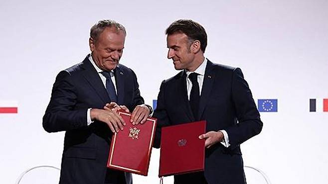 에마뉘엘 마크롱 프랑스 대통령과 도날트 투스크 폴란드 총리는 현지시간 9일 프랑스 동부 낭시에서 상호 협력과 우호를 위한 조약에 서명했습니다.