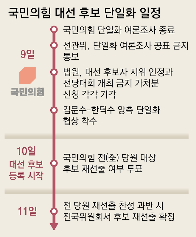 하지만 국민의힘은 자정을 넘겨 비상대책위원회와 선거관리위원회를 열고 후보 재선출 절차를 밟았다. 10일 전 당원 투표에서 후보 재선출 찬성이 과반이면 11일 전국위원회에서 김 후보와 한 전 총리 중 당 주도 여론조사에서 승리한 후보를 최종 대선 후보로 선출한다는 계획이다. 신동욱 수석대변인은 “선관위가 김 후보 선출 취소를 의결할 것”이라며 “이어 단일화 대상으로 지목돼 왔던 한 후보가 입당 원서를 제출하고 새로운 대선 후보자 선출 절차가 진행된다”고 말했다. 이에 앞서 법원은 김 후보 측이 낸 전당대회 및 전국위원회 개최 금지 가처분 신청과 후보 지위 인정 가처분 신청을 모두 기각했다.
