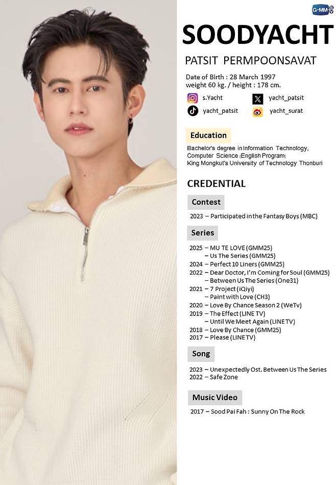 가수 겸 배우 수드얏(Soodyacht)은 국내 MBC 오디션 프로그램 판타지보이즈에도 출연했던 익숙한 가수다. 인스타 팔로워가 200만명 가까이 되며 가수와 연기를 겸하고 있다.