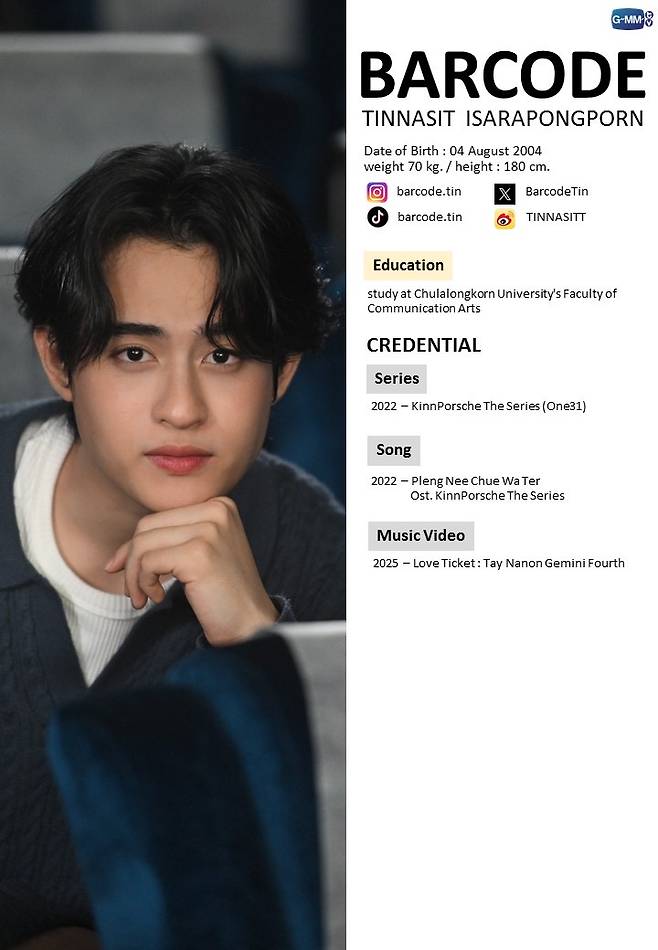바코드(Barcode) 역시 태국서 배우 겸 가수로 활동하고 있으며 역시 인스타 팔로워가 200만 명 가까운 인기 아이돌이다.
