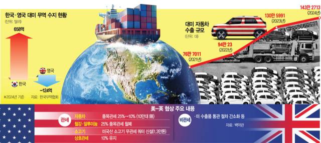 전 세계를 상대로 통상 전쟁을 벌이고 있는 도널드 트럼프 미국 대통령이 영국과 처음으로 관세 협상을 타결했다. 특히 품목관세 적용 대상인 자동차 관세를 낮추기로 하면서 한국산 자동차의 관세도 인하될 수 있다는 기대감이 커질 것으로 보인다. 하지만 미국이 자동차 관세 인하 조건으로 수출 물량 할당제(쿼터)를 내걸면서 향후 한미 통상 협상에 독소 조항으로 작용할 수 있다는 우려가 나온다.