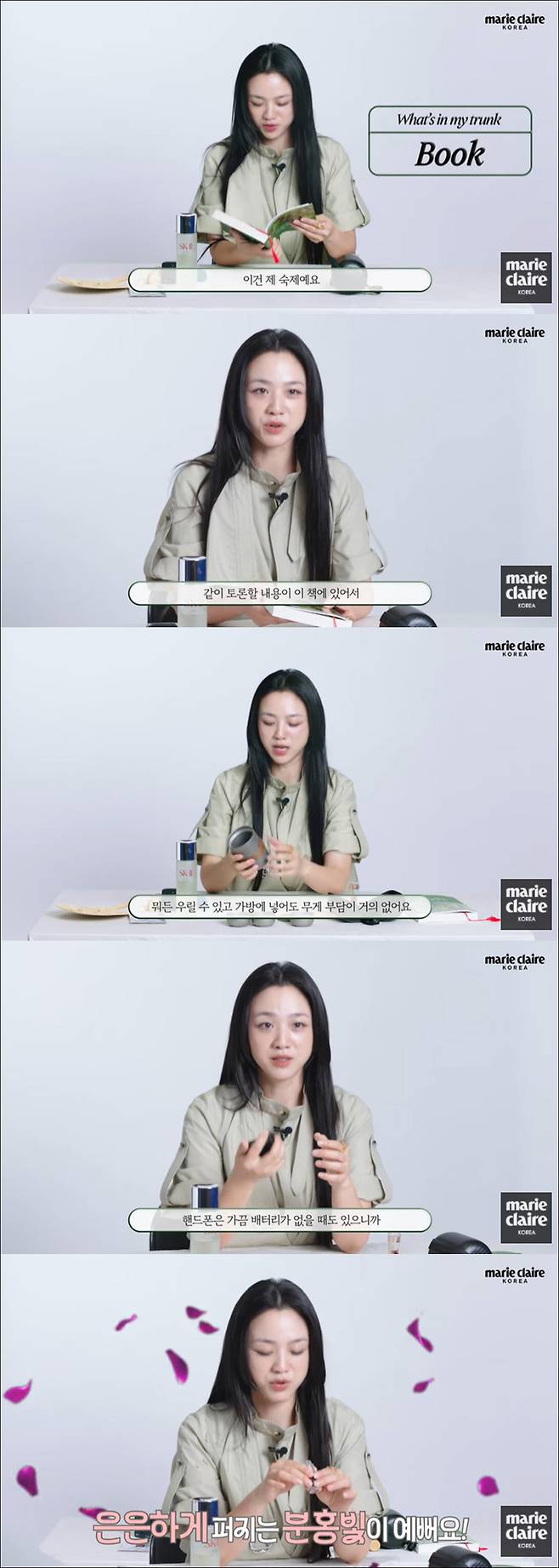 가장 아끼는 물건은 에센셜 요일. 탕웨이는 "우드향을 좋아해서 그런지 정말 편안하게 느껴진다. '헤어질 결심' 촬영 전에 샀던 건데 아직도 쓰고 있다. 가끔 그 향이 생각날 때만 사용한다"며 "2021년 3월 송광사라고 적혀있다. 왜 적었는지는 모르겠다. 누구한테 선물하려고 했는데 결국 안 줬다. 제가 정말 아끼는 작은 물건"이라 밝혔다.