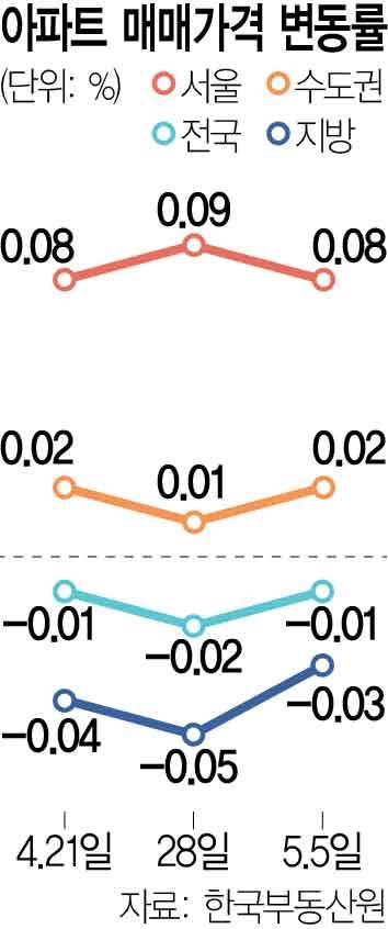전국 아파트 가격은 0.01% 떨어지며 지난주(-0.02%) 대비 하락 폭이 축소됐다. 수도권(0.01%→0.02%)은 상승 폭 확대, 서울(0.09%→0.08%)은 상승 폭 축소, 지방(-0.05%→-0.03%)은 하락 폭 축소 등을 기록했다.