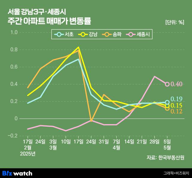 한국부동산원은 5월 첫째 주(5일 기준) 세종 주간 아파트 매매가격이 전주 대비 0.40% 상승했다고 분석했어요. 한 주 전 상승률(0.49%)과 비교하면 0.09%포인트 낮아졌어요. 한국부동산원 측은 "정주 여건이 양호한 도담·새롬·종촌동 선호단지 위주로 상승했다"고 짚었어요.