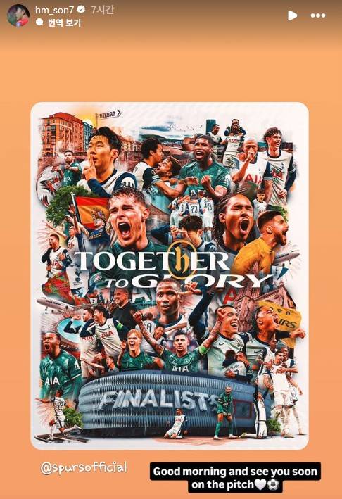 손흥민은 9일 자신의 SNS를 통해 토트넘의 UEL 결승 진출 축하 이미지를 게시하고 "좋은 아침, 경기장에서 만나요"라는 글을 남겼다.