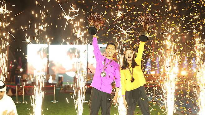 ▲ 우상혁(왼쪽)이 10일(한국시간) 카타르 도하 카타라 원형극장에서 열린 왓 그래비티 챌린지 남자 높이뛰기 대회에서 우승한 뒤, 여자부 1위 마후치크와 기념 촬영하고 있다.