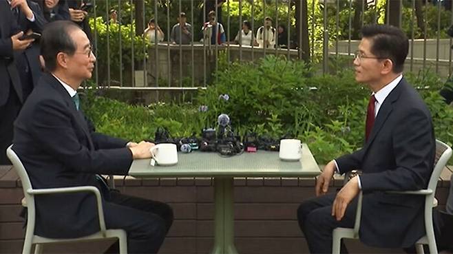 ▲ 국민의힘 김문수 대선후보와 무소속 한덕수 대선 예비후보가 8일 서울 국회 사랑재에 위치한 커피숍에서 회동을 마친 후 인사하고 있다.