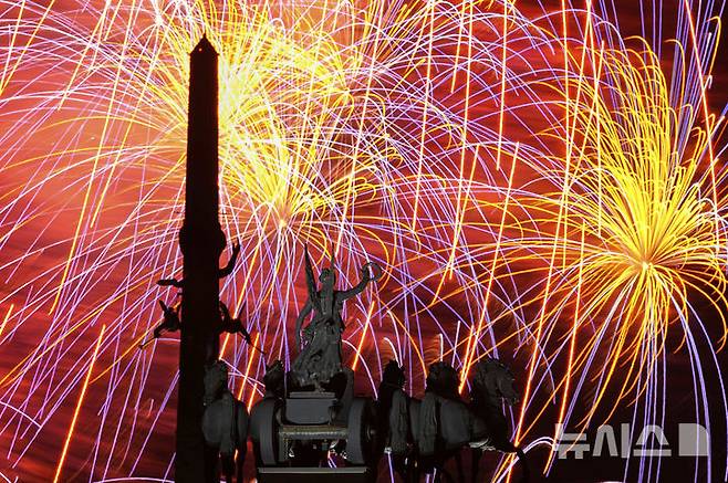 [모스크바=AP/뉴시스] 9일(현지 시간) 러시아 모스크바 포클론나야 고라(경배의 언덕)에 있는 개선문 꼭대기의 사두마차상(콰드리가) 위로 전승절 80주년 축하 불꽃놀이가 펼쳐지고 있다. 2025.05.10.