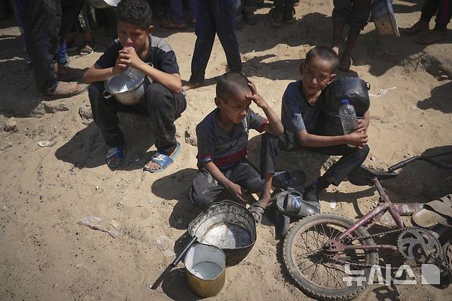 [칸유니스=AP/뉴시스] 9일(현지 시간) 가자지구 남부 칸유니스에서 팔레스타인 어린이들이 식기를 들고 음식 배급을 기다리고 있다. 2025.05.10.