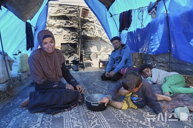 [칸유니스=AP/뉴시스] 9일(현지 시간) 가자지구 남부 칸유니스의 난민 텐트에서 음식 배급을 받지 못하고 빈손으로 돌아온 팔레스타인 여성이 가족들이 보는 앞에서 취재 기자에게 하소연하고 있다. 2025.05.10.