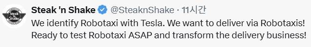 하지만 반년 이상 지난 지금 테슬라 로보택시에 대한 기대감은 스멀스멀 커지고 있습니다. 테슬라가 직접 발표하지도 않았는데 다른 기업들이 먼저 러브콜을 보내는 상황입니다. 실제로 미국 대형 외식 프랜차이즈 업체인 스테이크앤쉐이크(Steak'n Shake)의 엑스(옛 트위터) 공식 계정에는 9일(현지시간) “우리는 테슬라 로보택시로 배달을 하고 싶다”면서 “가능한 한 빨리 로보택시를 테스트할 준비가 돼있으며 배달 사업으로 전환하겠다”는 글이 올라왔습니다. 이 회사는 2018년 기준 628개 레스토랑을 운영했지만 코로나19 이후 점차 감소해 2023년 3월 기준 493개로 감축했습니다. 따라서 오프라인 비중을 줄이고 비대면 음식배달 사업을 확장하기 위해 테슬라와 손을 잡으려는 것으로 분석됩니다.