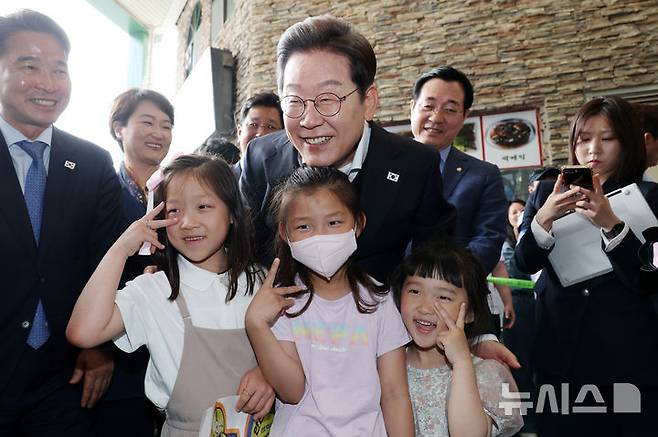 [의령=뉴시스] 조성우 기자 = 민심을 청취하는 '경청 투어'에 나선 이재명 더불어민주당 대선후보가 10일 경남 의령군 의령전통시장에서 어린이들과 사진을 찍고 있다. 2025.05.10. xconfind@newsis.com