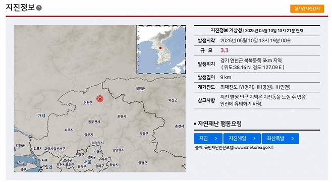 10일 기상청에 따르면 이날 오후 1시19분 연천군 북북동쪽 5㎞ 지역에서 9㎞ 깊이에서 규모 3.3의 지진이 발생했다.