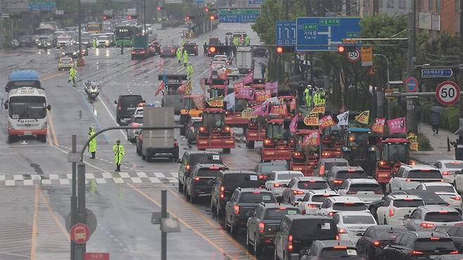 빗속에서 3개 차로를 이용해 저속 주행하던 트랙터 행렬은 12시 20분쯤 금천구 시흥대로 인근에서 '집회 제한 통고'를 내린 경찰 저지에 멈췄습니다.