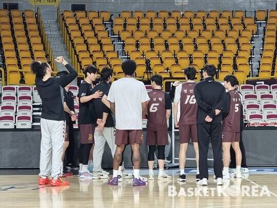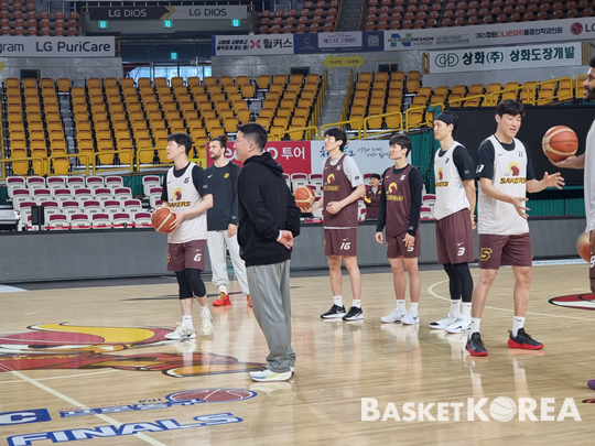선수들의 스트레칭이 끝나자, 조상현 LG 감독은 화이트보드 쪽으로 선수들을 모았다. 수비 중점사항을 선수들에게 전해줬다. 그 후 수비 훈련을 했다. 수비 훈련을 마친 선수들은 하프 코트에 모였다. 조상현 LG 감독은 그때 “1차전이라고 생각하자”고 말했다.