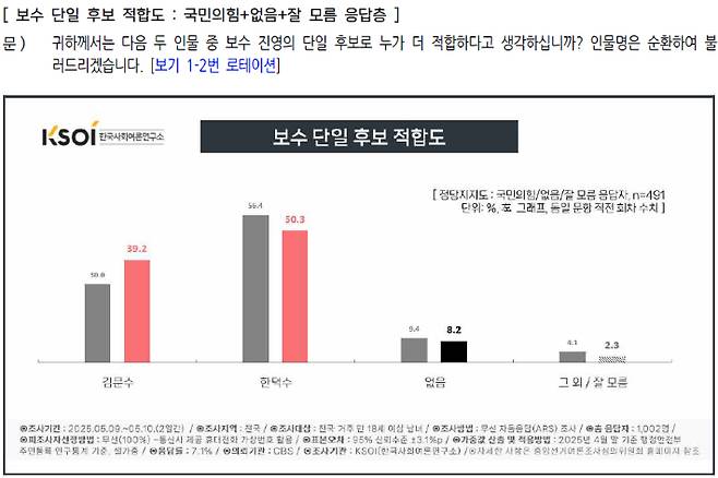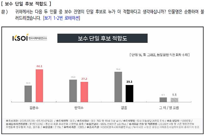 CBS노컷뉴스가 한국사회여론연구소(KSOI)에 의뢰해 전국 만 18세 이상 남녀 1002명을 대상으로 9일부터 10일 이틀간 진행한 여론조사에 따르면 '보수 진영 단일 후보로 누가 적합하느냐'는 질문에 김문수 후보가 44.1%, 한덕수 예비후보가 27.2%를 기록했다.