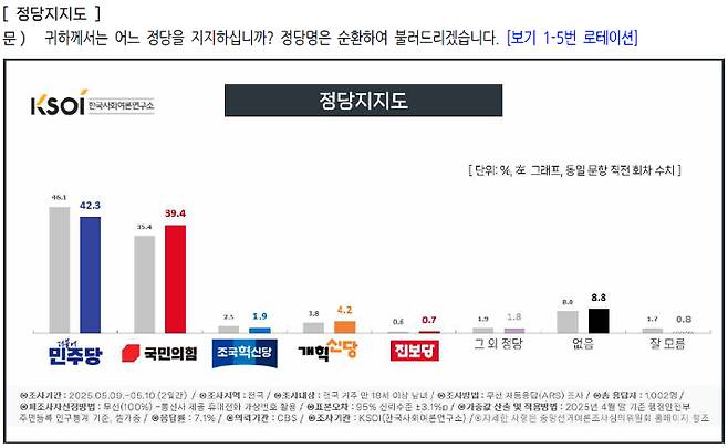 정당 지지도는 민주당 42.3%, 국민의힘 39.4%, 개혁신당 4.2%, 조국혁신당 1.9% 순으로 나타났다.
