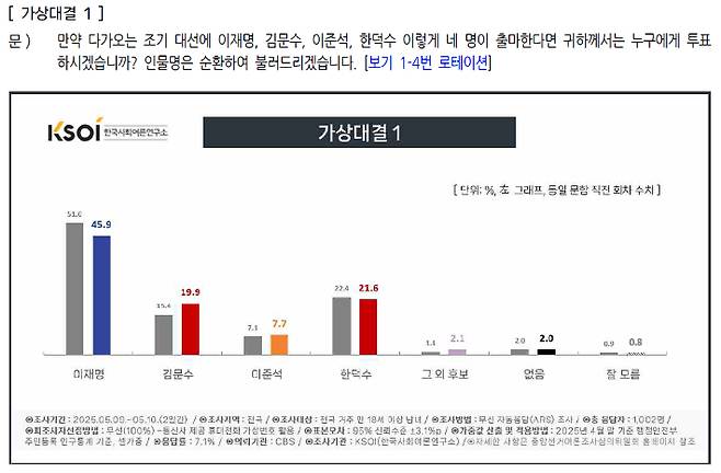 이재명 후보는 한덕수, 김문수, 이준석 후보 출마를 가정한 4자 대결에서 45.9%를 얻으며 선두를 달렸다. 나머지 후보들은 각각 21.6%, 19.9%, 7.7%를 얻었다.