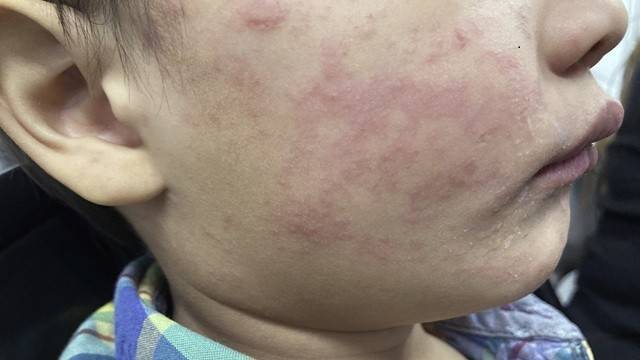 ② 전신 발진: 머리에서 시작해 몸통, 사지로 진행되는 발진으로, 홍역을 구별할 수 있는 거의 유일한 증상이다. 하지만 이마저도 수두 초기나 다른 발진성 질환과 감별이 쉽지 않다.