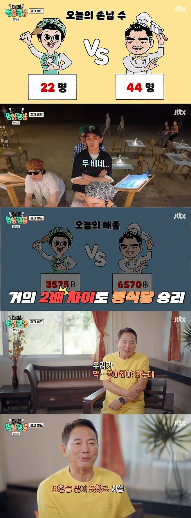 결과에 따르면 손님 수는 팽식당이 22명, 봉식당이 44명으로 정확히 두 배 차이가 났고, 음식 판매량은 팽식당 15개, 봉식당 22개로 7개 차이였다. 매출 역시 팽식당은 2,575바트, 봉식당은 6,570바트로 약 2.5배 차이가 나는 압도적인 결과였다.