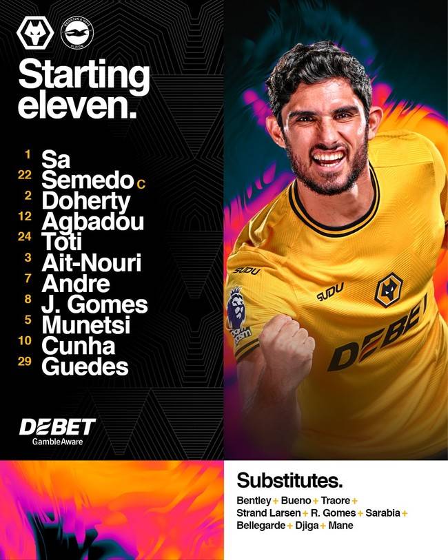 경기를 앞두고 울버햄튼은 선발 라인업을 공개했다. 사, 세메두, 도허티, 아그바두, 토티, 아잇-누리, 안드레, 고메스, 무네시, 쿠냐, 게드스가 선발로 나선다.