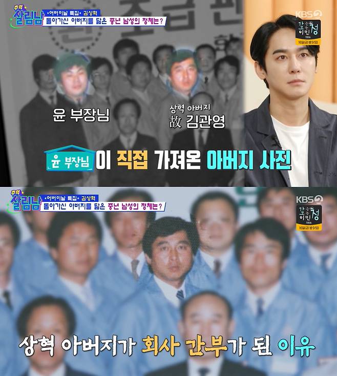 김상혁은 "좀 많이 놀랐다. 저 뒤에서 아버지가 같이 걸어올 것 같고"라며 눈물을 참지 못했다. 김상혁도 몰랐던 아버지의 사진을 가져온 동료는 "너네 아버지가 제일 미남이다"라며 아버지와의 추억을 전해줬다.