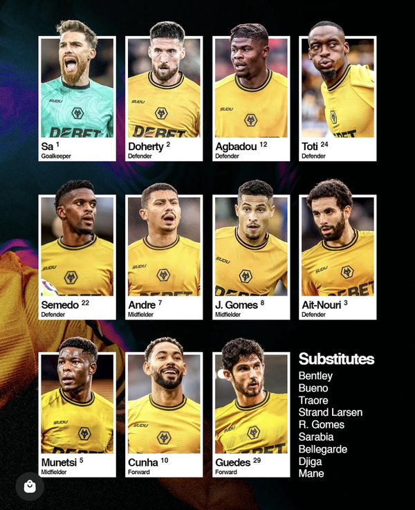울버햄튼은 3-4-2-1 포메이션을 가동했다. 쿠냐, 게데스, 무네트시, 아이트-누리, 안드레, 고메스, 세메두, 토티, 아그바두, 도허티, 사가 선발 출격했다. 황희찬은 명단에서 제외됐다.