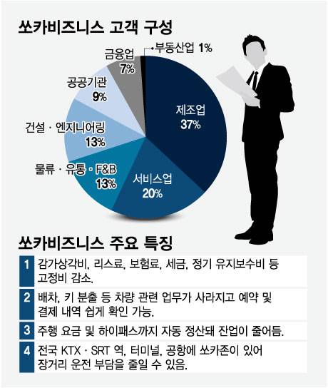 '쏘카비즈니스'는 본사를 수도권에 두고 제조, 연구시설, 지사 등 외근이나 장거리 출장이 많은 기업이 주로 이용한다. 이 서비스의 주요 고객사를 분석한 결과 제조업이 37%로 가장 많았고 서비스업 20%, 물류·유통 13%, 건설·엔지니어링 13% 순으로 나타났다.