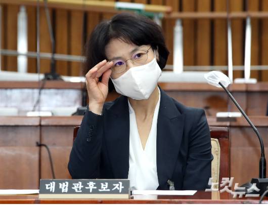 오경미 대법관 후보자는 이날 국회 인사청문회에서 직권남용죄에 대해 "국민 법 감정에 맞게 처벌의 기준을 새로이 정립할 필요가 있다"고 밝혔다. 오 후보자는 '직권 없이는 직권남용도 없다'는 직권남용죄의 법리를 설명하며 "직권남용 재판을 해보니 직무 범위가 아닌 경우에는 무죄 판결이 나는 경우가 종종 있다"고 설명했다. 오 후보자의 배우자가 지난 2020년 2월 판사 신분으로 창원시 제2부시장직에 지원했다가 탈락해 법관의 정치적 중립 의무 위반이라는 논란이 일었다. 오 후보자는 "(남편의) 판사 사직과 지원이 거의 동시에 이뤄졌다"며 "당시에 사직서가 그렇게 늦게까지 수리가 안 될지 예상 못 했다"고 해명했다. 오 대법관은 이재명 후보 사건 파기환송심에서 12명의 대법관 중 반대 의견을 낸 2명 중 한 명이다. 사진=윤창원 기자