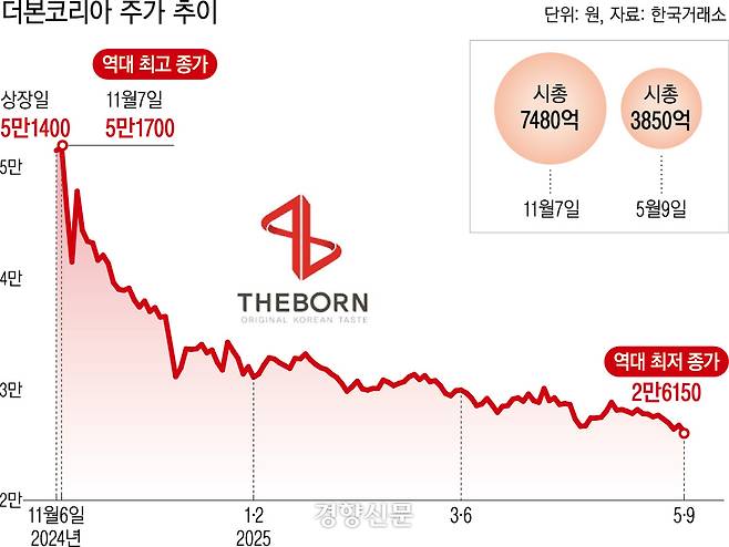 이날 유가증권시장(코스피)에서 더본코리아는 주당 2만6150원에 거래를 마감했습니다. 역대 최저 종가를 경신했습니다. 상장 다음날이었던 지난해 11월7일 기록한 역대 최고 종가(5만1700원)와 비교하면 약 6개월 만에 49.4%나 폭락했습니다. 약 7500억원에 달했던 시가총액도 약 3600억원이 증발했죠.