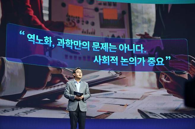 <'저속노화를 넘어선 역노화 가능한가?' 세션에서 발표 중인 이준호 서울대 생명과학부 교수>