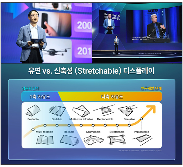 SDF2010 때 기조연사로 왔던 제임스 캐머런 '아바타'의 감독이 강조했던 3D기술이 당시에는 왜 성공하지 못했는지 그리고 영화에 나오는 미래 기술들은 대개 20~30년 후에는 우리 일상에서도 나타난다면서 지금의 신축성 디스플레이의 연구 단계는 어느 정도인지 그리고 현실과 화면의 경계를 허문 디스플레이는 언제쯤 나올 수 있을지 등에 대해 전했습니다.