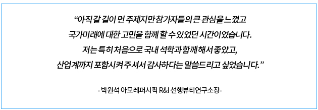포럼을 보다 느낀 것은 워낙 우리 과학기술계의 저명한 석학들과 업계 최고 리더들 간의 토의여서 그런지 '10년 안에는 반드시 된다', '꼭 이룰 수 있다'는 식의 희망적인 얘기들이 계속 전해져, 최근 어디서 이렇게 희망적인 얘기를 들었던 곳이 또 있었나 싶을 정도로 사회적인 이슈를 다루는 포럼과는 분위기가 확연히 달랐습니다.
