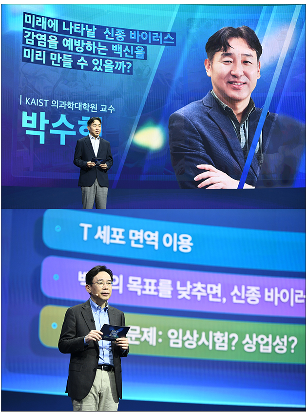 특히 학계 연사인 신의철, 박수형 KAIST 의과학대학원 교수는 기존의 중화항체를 이용한 세포의 바이러스 침투를 예방하는 방법이 아닌 T세포 면역을 이용하면 감염된 세포를 제거함으로써 더 증식되지 못하는 방법을 통해 미래에 나타날 감염병의 백신도 미리 만들 수 있지 않을까 그 가능성을 제시했습니다.
