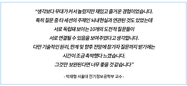 그렇다면 <SBS X 그랜드 퀘스트>에 참여한 연사들은 제1회 <SBS X 그랜드 퀘스트>를 어떻게 느꼈을까요? 오늘은 파트1 (역노화 기술, 신종 바이러스 예방 백신, 공간 디스플레이) 세션에 참여한 연사들의 피드백을 중심으로 정리해 봤습니다.