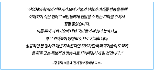 안녕하세요? 지난달 24일, 제1회 <SBS X 그랜드 퀘스트>-'기술주권 확보, 그 10가지 질문'라는 과학기술계 전문가 포럼을 서울대와 공동주최로 잘 마무리했는데요. <SBS X 그랜드 퀘스트>는 앞으로 10~15년 뒤 대한민국의 '기술주권'을 염두에 둔 과학, 기술계의 중∙장기적인 연구들을 소개하고, 산학이 같이 모여 관련 분야를 토론하는 자리였습니다. 그러다 보니 SBS가 20년째 기획해 온 SDF(SBS D포럼)와는 달리 해외연사도 없고, 대중포럼이 아니다 보니 내용도 관련 분야의 사람들이 아니면 어려워서, 어떻게 하면 전공자가 아니더라도 관심을 가지고 볼 수 있게 쉽게 다가갈 수 있을까가 저희에게는 큰 도전과제였는데요.