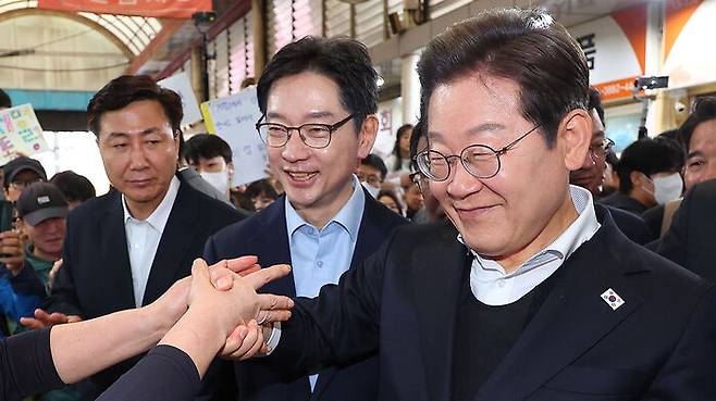 ▲ 영남 신라벨트 골목골목 경청투어에 나선 더불어민주당 이재명 대선 후보가 10일 경남 사천시 사천읍시장을 찾아 상인들과 인사하고 있다.