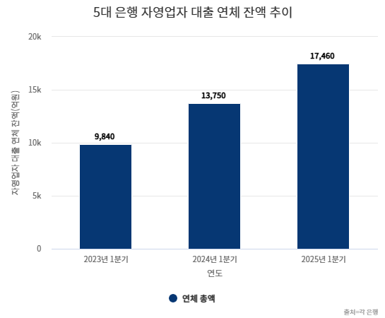 11일 금융권에 따르면 올해 1분기 말 KB국민·신한·하나·우리·NH농협은행 등 5대 주요 은행에서 1개월 이상 연체된 개인사업자 대출 잔액은 1조7460억원에 달했다. 지난해 같은 기간(1조3750억원)보다 27%가량 불어났다. 지난 2023년 1분기(9840억원)와 비교하면 2년 새 1.8배 증가했다.