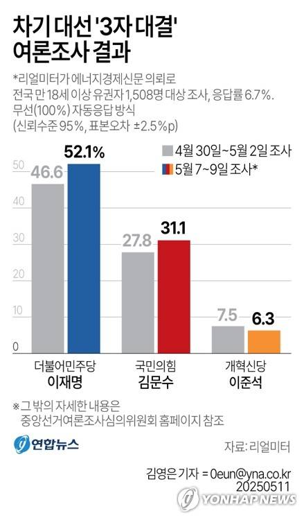 3자 가상대결…이재명 52.1% 김문수 31.1% 이준석 6.3%[리얼미터]