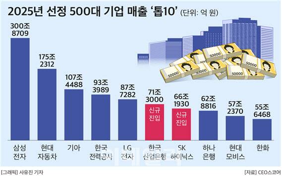 500대 기업 상위 10개 기업에는 한국산업은행과 SK하이닉스가 신규 진입했다. 한국산업은행은 지난해 영업수익 71조3000억원으로 전년보다 22조8714억원(47.2%) 증가하면서 매출 순위가 12위에서 6위로 상승했다. SK하이닉스도 지난해 매출 66조1930억원으로 전년보다 무려 33조4273억원(102.0%) 늘어나며 매출 순위가 25위에서 7위로 올라섰다.